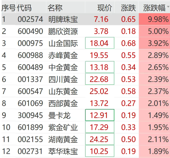 黄金珠宝指数走高,明牌珠宝涨停。鹏欣资源、湖南黄金、赤峰黄金等多股走高。COMEX黄金期货收涨1.85%,报3001.3美元/盎司,续创历史新高。