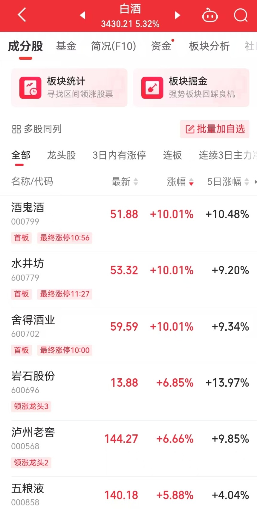 酒鬼酒、舍得酒业、水井坊涨停。泸州老窖涨超6%,酒鬼酒、老白干酒、五粮液、山西汾酒、贵州茅台等均有不同程度涨幅。消息面上,中信建投表示,当前烟酒终端已经处于库存低位,需求修复将能快速传导至酒企,龙头白酒仍有较好的成长空间,全年预期或逐步提升。