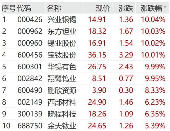 有色金属板块,兴业银锡、东方钽业、锡业股份、华锡有色、宝钛股份等多股涨停。