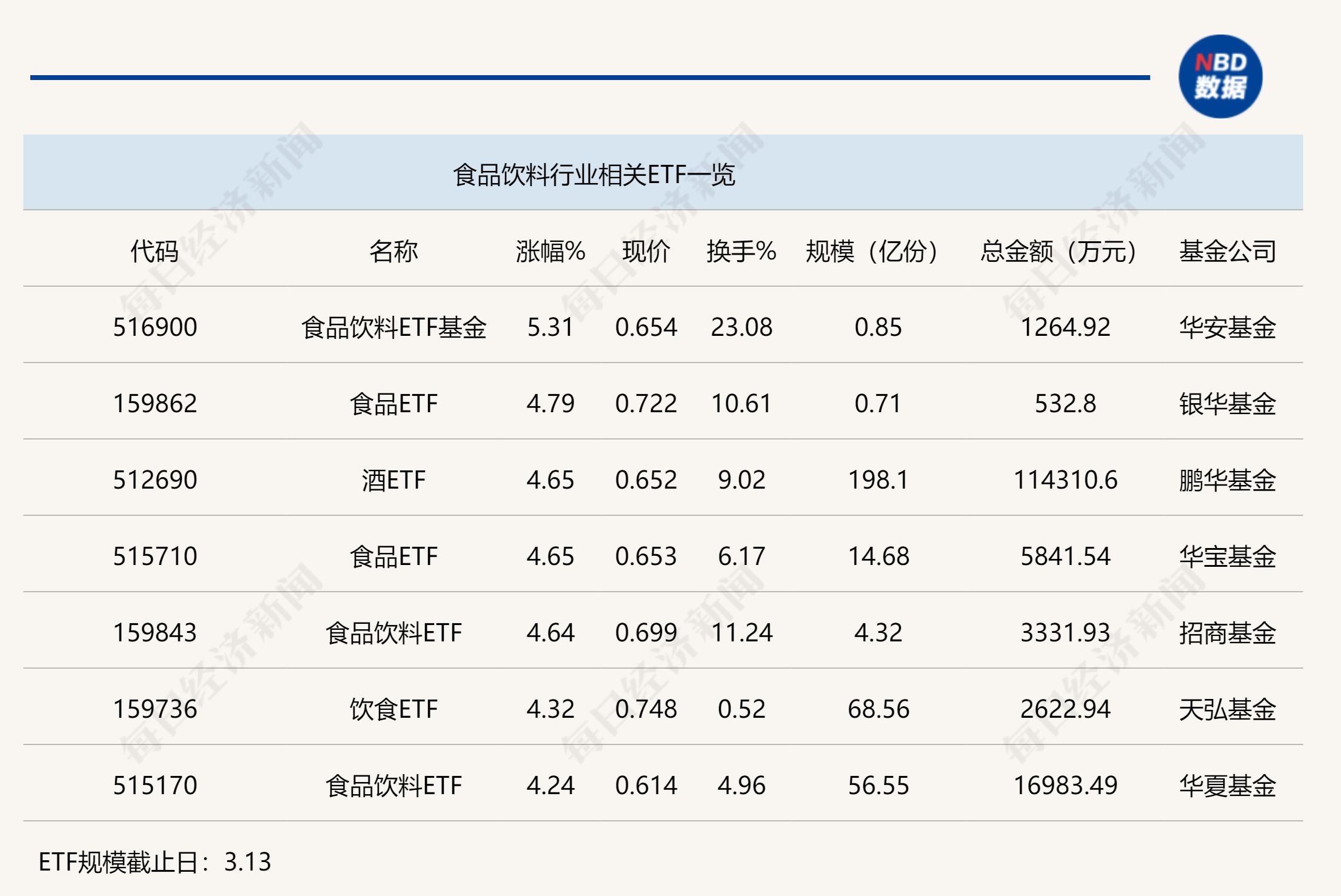 点评:食品饮料ETF基金(516900)今日上午涨幅达到5.31%,该ETF规模不大,只有0.85亿份,半日成交金额为1265万元,其追踪的是中证申万食品饮料指数。