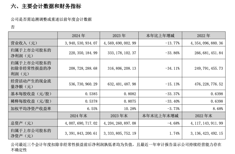 3月13日晚间,飞亚达精密科技股份有限公司(以下简称“飞亚达”或“公司”)发布2024年年度报告。报告显示,公司2024年年度营业收入39.41亿元,同比下降13.77%;归属于上市公司股东的净利润2.2亿元,同比下降33.86%;归属于上市公司股东的扣除非经常性损益的净利润2.09亿元,同比下降34.11%;基本每股收益0.5385元/股。拟向全体股东每10股派发现金红利4.00元(含税)。