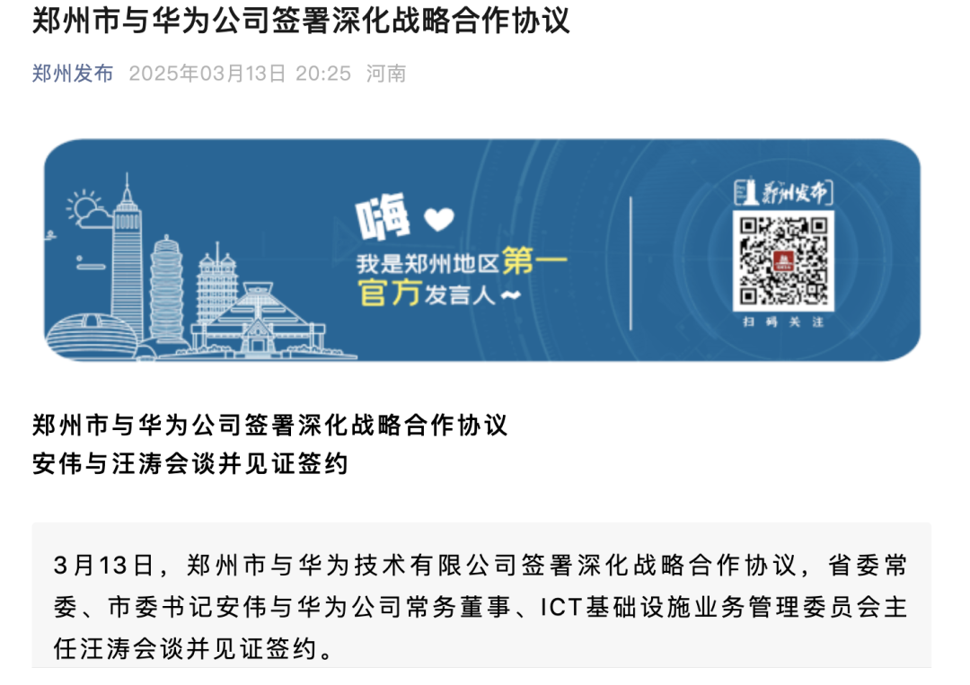 此前的3月1日,河南省政府与华为签署全面深化战略合作协议,双方将集聚人才、技术、产品等资源,在先进计算、数字化转型、人工智能、新能源汽车、基层治理、智慧交通等领域开展深度合作,落地更多产业。