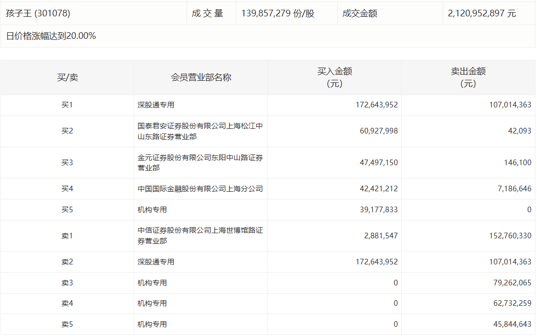 孩子王今日20cm涨停,成交额21.21亿元,换手率11.22%,盘后龙虎榜数据显示,深股通专用席位买入1.73亿元并卖出1.07亿元,1家机构专用席位净买入3917.78万元,有3家机构专用席位净卖出1.88亿元。