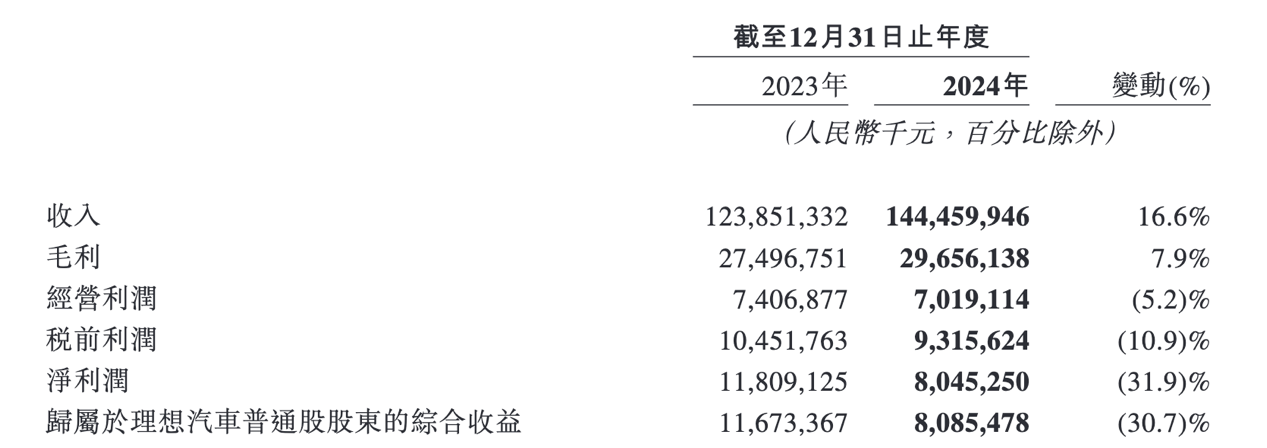 3月14日,理想汽车(02015/LI)发布年度业绩公告。2024全年公司收入1444.6亿元,同比增长16.6%;毛利率20.5%,略低于上年的22.2%;股东应占溢利80.3亿元,同比大幅缩水31.4%。