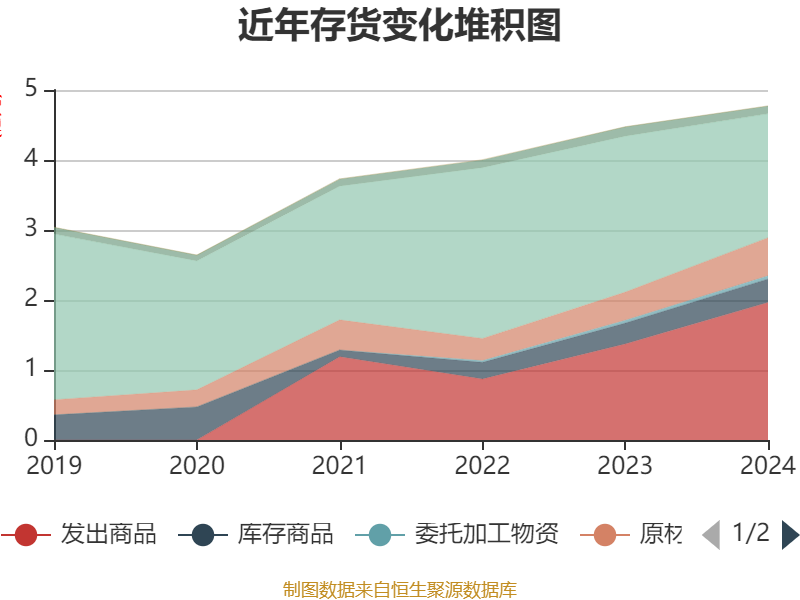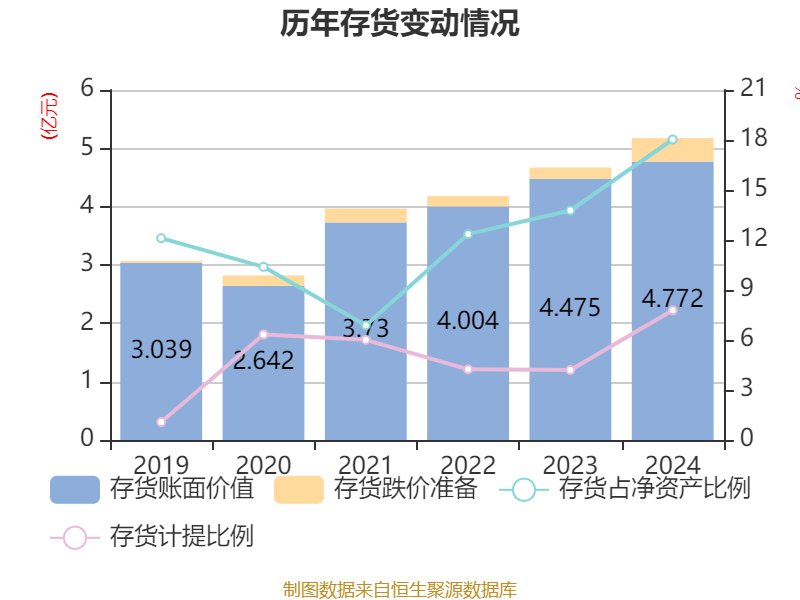 从存货变动来看,截至2024年末,公司存货账面价值为4.77亿元,占净资产的18.03%,较上年末增加2974.88万元。其中,存货跌价准备为4025.06万元,计提比例为7.78%。