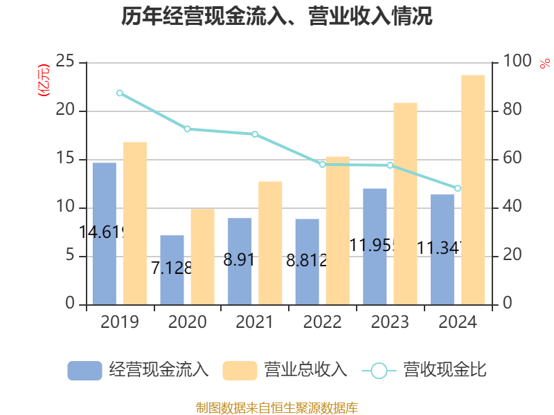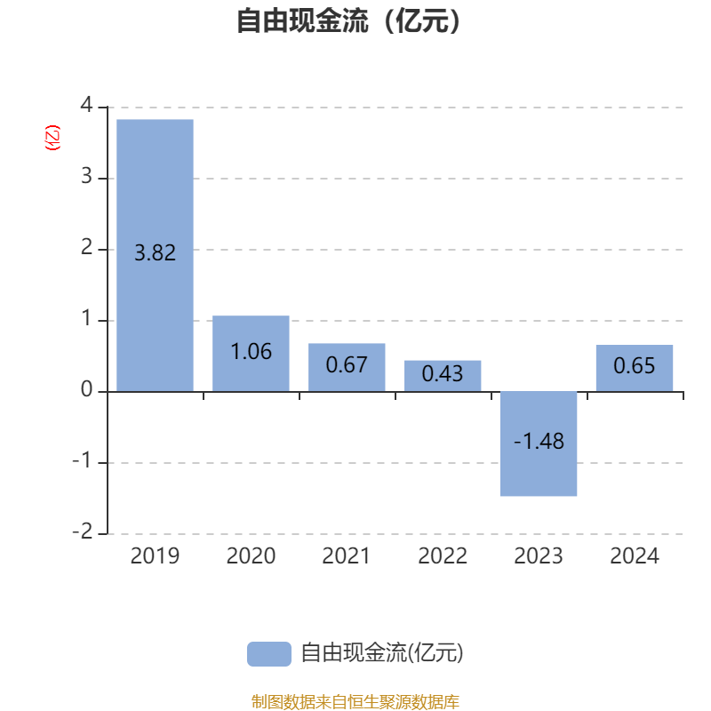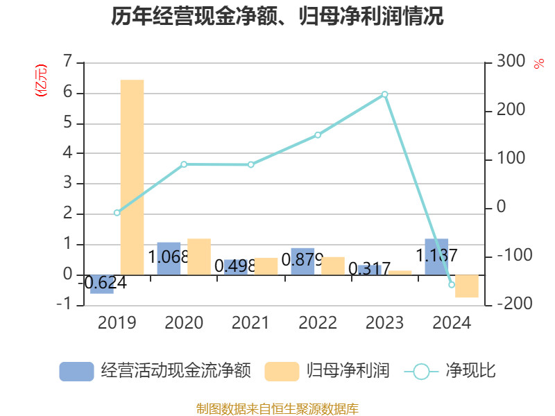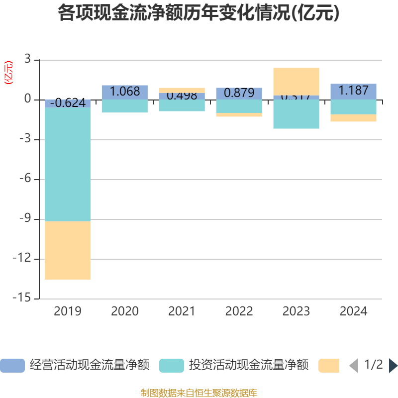 截至2024年,公司经营活动现金流净额为1.19亿元,同比增长274.63%;筹资活动现金流净额-5392.19万元,同比减少2.61亿元;投资活动现金流净额-1.12亿元,上年同期为-2.19亿元。