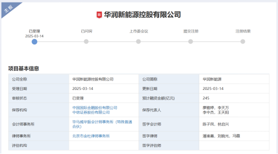 3月14日,深交所官网显示,华润新能源控股有限公司(简称“华润新能源”)主板IPO申请获深交所受理,这是深交所今年受理的首单IPO项目,也是A股今年首单主板IPO项目。