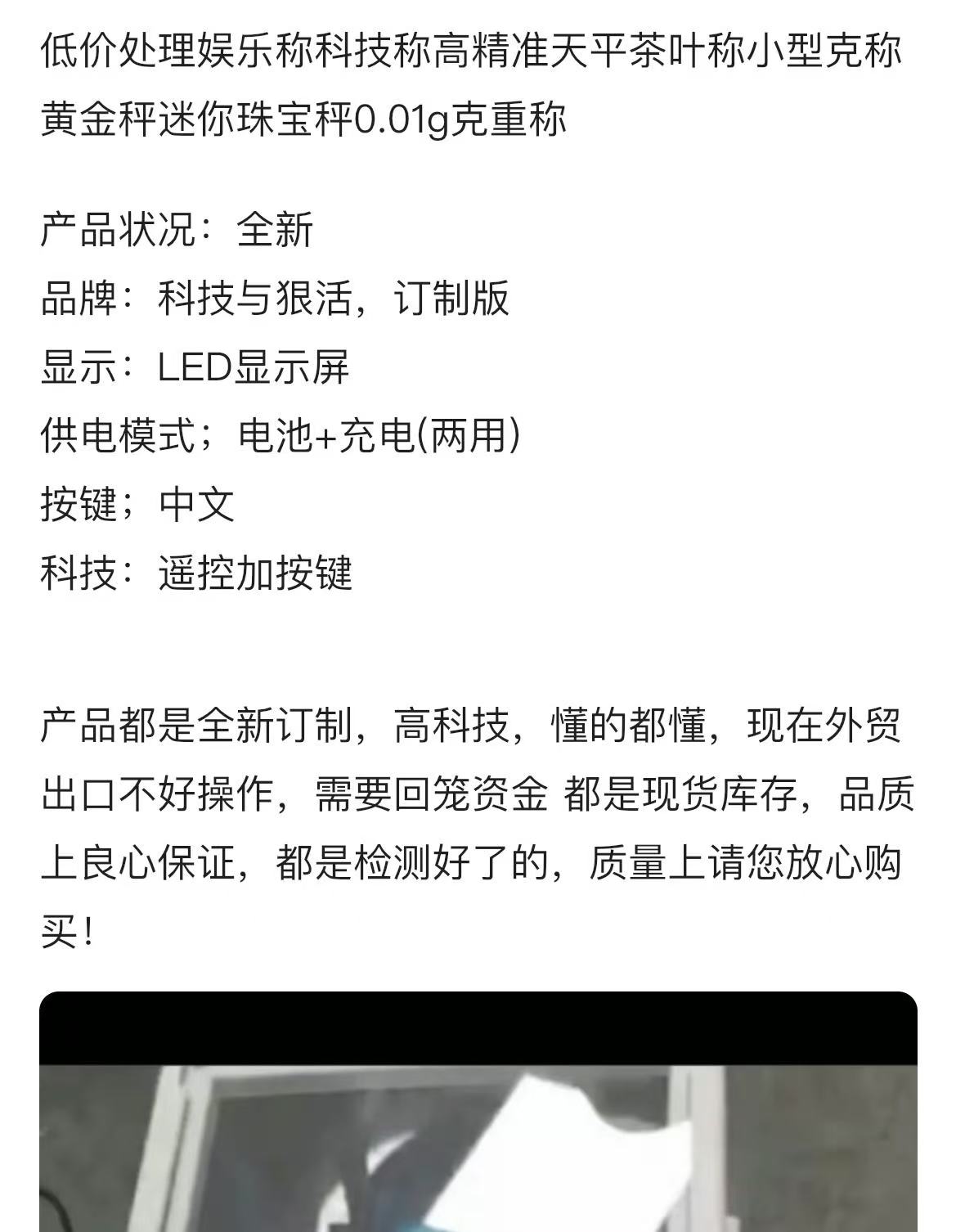 如一个名为“电子秤厂家定制”的商家,在其商品页面的介绍中显示,“品牌”为“科技与狠活,订(定)制版”;“科技”为“遥控加按键”;商家还在产品介绍中提及“高科技,懂的都懂”。
