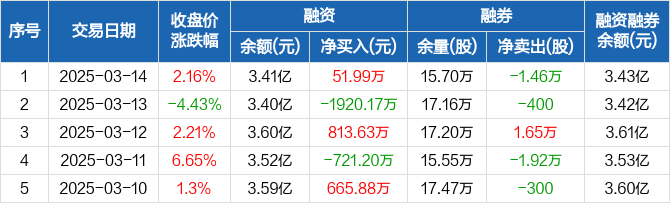 融资方面,当日融资买入3282.67万元,融资偿还3230.68万元,融资净买入51.99万元。融券方面,融券卖出100股,融券偿还1.47万股,融券余量15.7万股,融券余额155.74万元。融资融券余额合计3.43亿元。