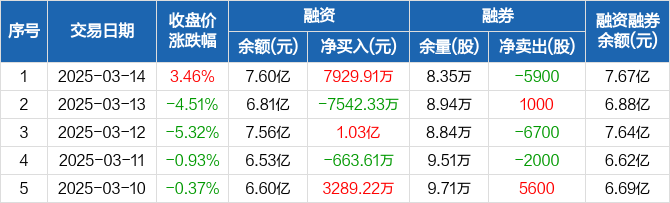融资方面,当日融资买入1.7亿元,融资偿还9027.73万元,融资净买入7929.91万元。融券方面,融券卖出5300股,融券偿还1.12万股,融券余量8.35万股,融券余额732.38万元。融资融券余额合计7.67亿元。