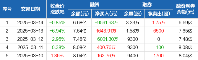 融资方面,当日融资买入8840.61万元,融资偿还1.84亿元,融资净偿还9591.63万元,净偿还额创12个月新高。融券方面,融券卖出2.3万股,融券偿还5500股,融券余量3.33万股,融券余额46.52万元。融资融券余额合计6.69亿元。