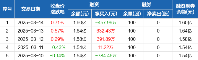 融资方面,当日融资买入1922.8万元,融资偿还2380.79万元,融资净偿还457.99万元。融券方面,融券卖出0股,融券偿还0股,融券余量100股,融券余额710元。融资融券余额合计1.6亿元。