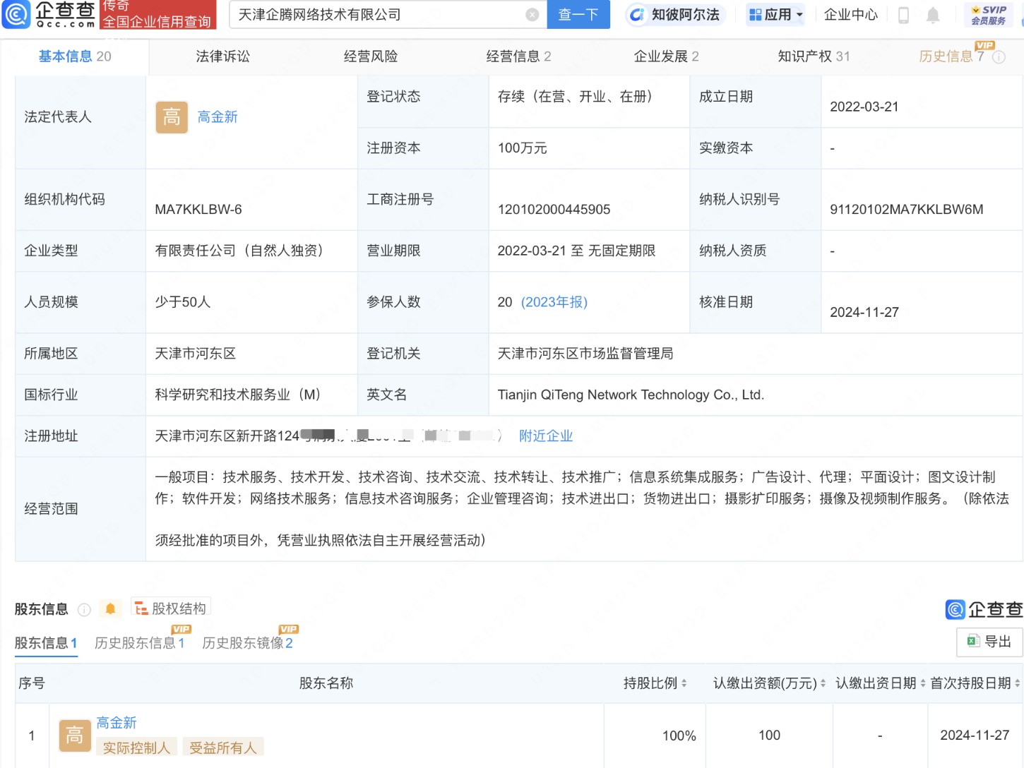 人民财讯3月15日电,315曝光获客黑软件,企查查APP显示,天津企腾网络技术有限公司成立于2022年,法定代表人为高金新,注册资本100万元,经营范围含软件开发、网络技术服务等,由高金新全资持股。该公司拥有20项软件著作权,其中包括“云占位全网推广获客系统”、“云视频广告内容推送系统”、“云占位推广文案创作系统”等。
