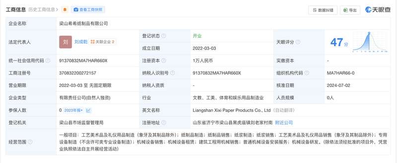 天眼查App显示,梁山希希纸制品有限公司成立于2022年3月,注册资本仅1万元人民币,由法定代表人刘成乾全资持股。