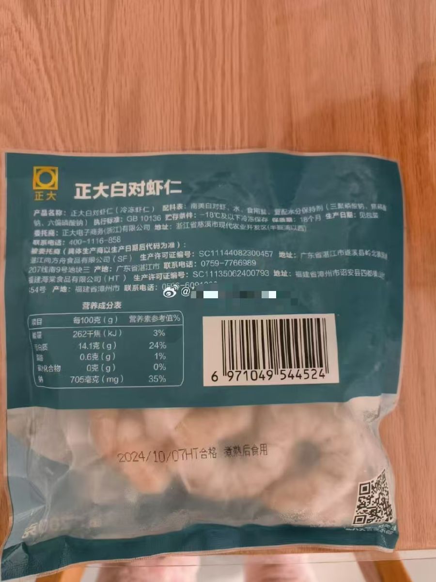 随即,有消费者在社交平台上晒出了自己购买的正大白对虾仁,其产品说明中明确标注,湛江尚方舟食品有限公司为被委托商。