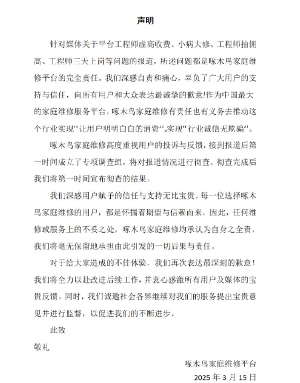 当晚,啄木鸟家庭维修官方微博发布声明道歉:所述问题都是啄木鸟家庭维修平台的完全责任,已第一时间成立专项调查组,将对报道情况进行彻查,彻查完成后将第一时间宣布结果。