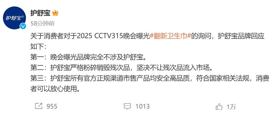 关于消费者对于2025 CCTV315晚会曝光翻新卫生巾的询问,护舒宝品牌在3月15日晚回应如下: