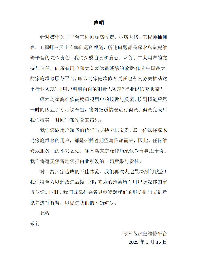 相关内容播出后,啄木鸟家庭维修在微博发布声明,就虚高收费致歉,称“深感自责和痛心,将改进后续工作”。