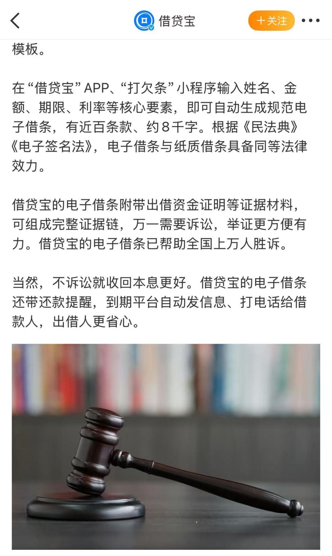 借贷宝、人人信等平台生成的电子签是什么?广州日报记者注意到,借贷宝官方微博曾声称,在“借贷宝”APP、“打欠条”小程序输入姓名、金额、期限、利率等核心要素,即可自动生成规范电子借条,有近百条款、约8千字。 借贷宝的电子借条附带出借资金证明等证据材料,可组成完整证据链,万一需要诉讼,举证更方便有力。借贷宝的电子借条已帮助全国上万人胜诉。