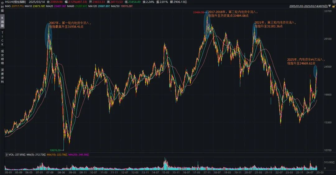 回眸近二十年来港股市场,共出现了四次较为明显的内地资金涌入: