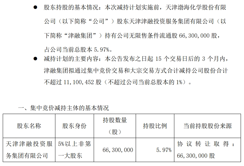 3月16日晚间,渤海化学(600800)发布公告,股东天津津融投资服务集团有限公司因自身资金安排需要,计划在2025年4月8日至2025年7月7日期间,通过集中竞价和大宗交易方式,合计减持不超过1110万股公司股份,占公司总股本的1%。