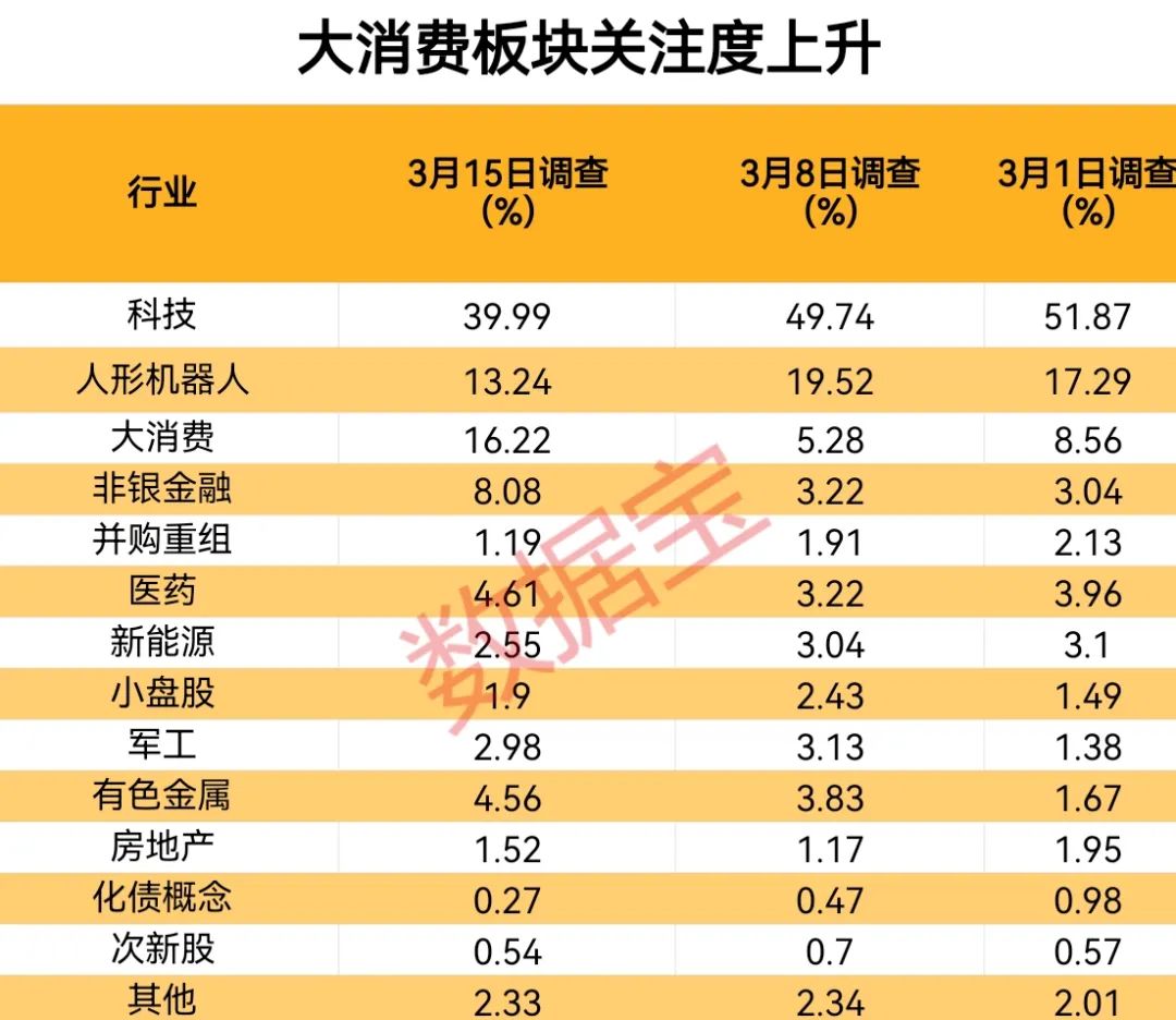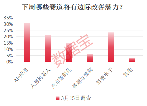 在“您认为下周哪些板块的表现将最为突出?”的调查中,“科技”板块由上周的62%,下降至42%;看好“消费”板块的比例由11.26%上升至34%。在方向选择上,“您认为下周哪些赛道将有边际改善潜力?”的问卷中,Al+应用、消费电子、人形机器人的认同占比较高。