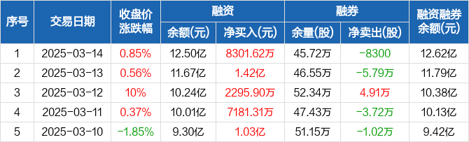 融资方面,当日融资买入2.72亿元,融资偿还1.89亿元,融资净买入8301.62万元,连续5日净买入累计4.23亿元。融券方面,融券卖出1.32万股,融券偿还2.15万股,融券余量45.72万股,融券余额1249.07万元。融资融券余额合计12.62亿元。