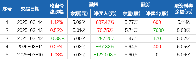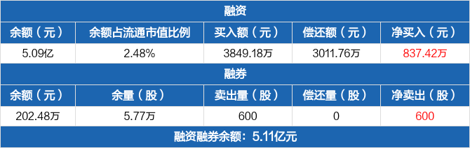 融资方面,当日融资买入3849.18万元,融资偿还3011.76万元,融资净买入837.42万元。融券方面,融券卖出600股,融券偿还0股,融券余量5.77万股,融券余额202.48万元。融资融券余额合计5.11亿元。