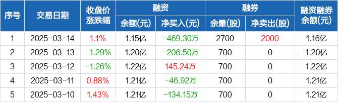 融资方面,当日融资买入306.07万元,融资偿还775.37万元,融资净偿还469.3万元。融券方面,融券卖出2000股,融券偿还0股,融券余量2700股,融券余额17.14万元。融资融券余额合计1.16亿元。