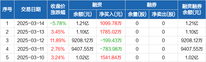 融资方面,当日融资买入4368.81万元,融资偿还3269.03万元,融资净买入1099.78万元。融券方面,融券卖出0股,融券偿还0股,融券余量0股,融券余额0元。融资融券余额合计1.21亿元。
