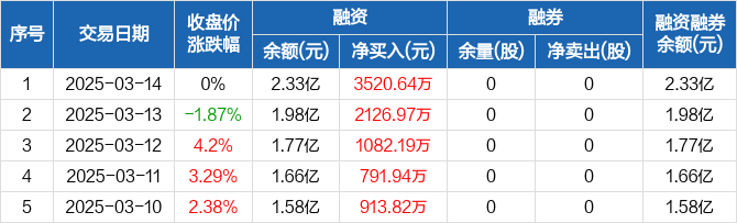 融资方面,当日融资买入5113.36万元,融资偿还1592.72万元,融资净买入3520.64万元,净买入额创历史新高,连续9日净买入累计9448.18万元。融券方面,融券卖出0股,融券偿还0股,融券余量0股,融券余额0元。融资融券余额合计2.33亿元。