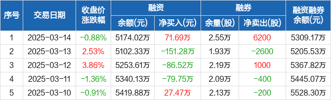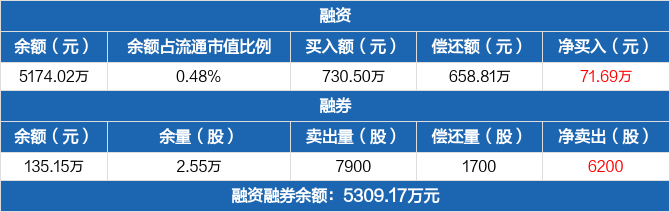 融资方面,当日融资买入730.5万元,融资偿还658.81万元,融资净买入71.69万元。融券方面,融券卖出7900股,融券偿还1700股,融券余量2.55万股,融券余额135.15万元。融资融券余额合计5309.17万元。