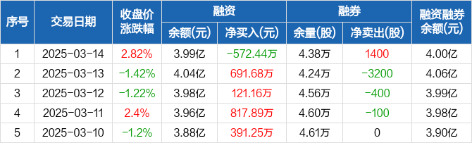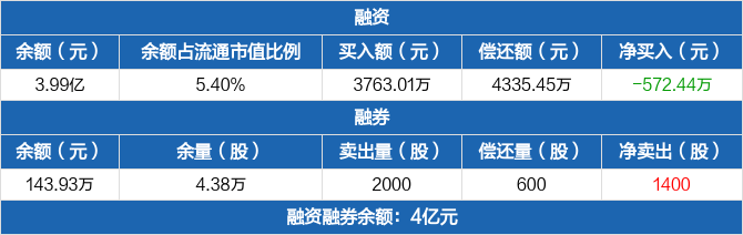 融资方面,当日融资买入3763.01万元,融资偿还4335.45万元,融资净偿还572.44万元。融券方面,融券卖出2000股,融券偿还600股,融券余量4.38万股,融券余额143.93万元。融资融券余额合计4亿元。
