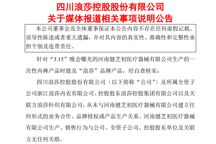 不过3月16日晚,浪莎股份在回应公告中称,针对“3·15”晚会曝光河南健芝初医疗器械有限公司生产的一次性内裤产品时提及“浪莎”品牌产品。经自查核实,公司及旗下全资子公司、控股股东、关联方未与其有任何形式的业务合作、品牌授权或产品生产关系。