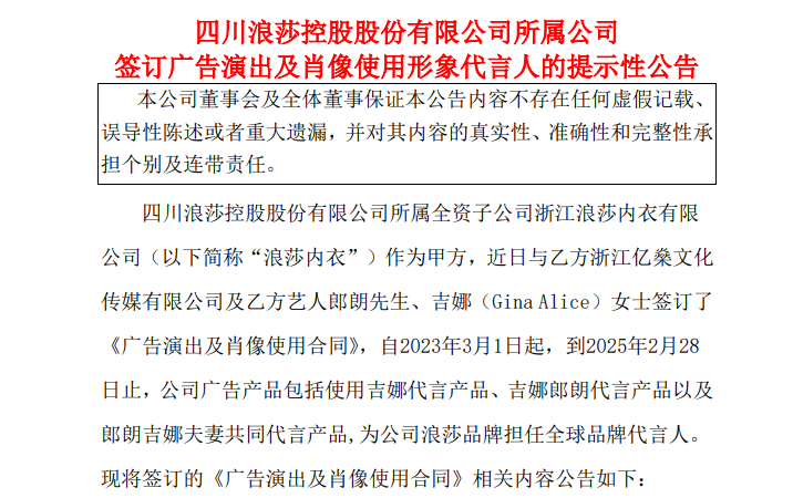时间回到2023年1月初,浪莎股份发布公告,公司与郎朗和吉娜夫妇签订广告代言合约,为公司浪莎品牌担任全球品牌代言人,形象代言费用共计为含税275万元。