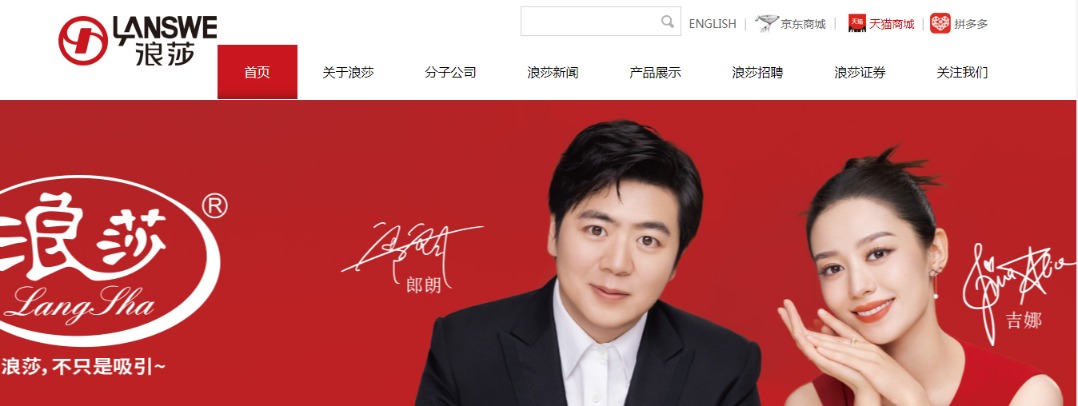 只是,截至3月15日晚,在浪莎股份大股东浪莎控股集团的官网首页上,郎朗夫妇的代言形象赫然在列,郎朗夫妇关于浪莎的宣传视频也都一一呈现着,并没有删除或者下架。