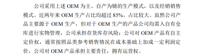 浪莎股份已经明确,公司对OEM产品承担主要责任,拥有运营权。
