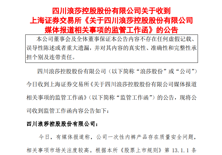 新闻播出后,上交所在3月15日当晚就向浪莎股份(600137)下发了监管工作函,要求公司就媒体报道的相关问题作出回应。