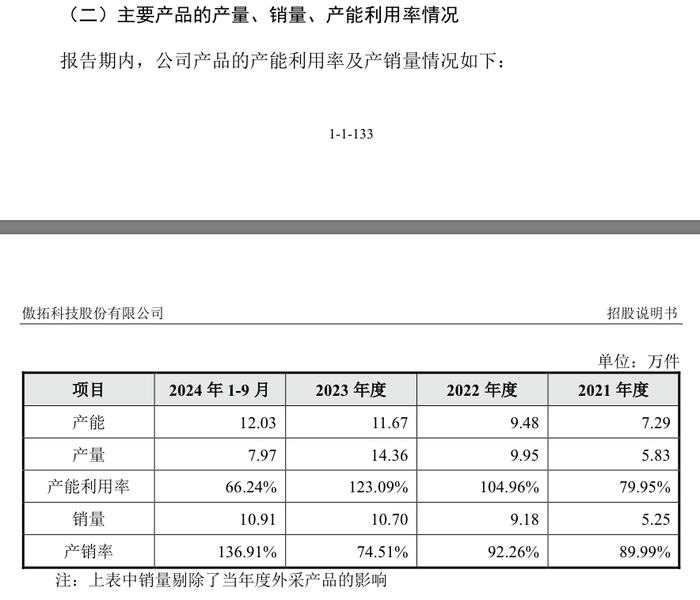数据显示,2022年、2023年傲拓科技的产能利用率分别为104.96%、123.09%,不过公司2024年前三个季度的产能利用率却来到了66.24%。傲拓科技解释,自己在2022年新增一条SMT贴片线,且该设备在2024年实现了完全达产。