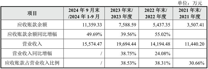 其中,2022年至2024年9月的应收账款余额分别为5437.35万元、7588.59万元、11359.33万元,同比增幅分别为55.02%、39.56%、49.69%,占营业收入收入比重分别为24.08%、38.75%、72.94%。