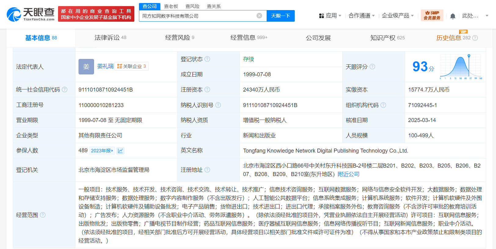 南方财经3月17日电,天眼查App显示,近日,同方知网数字出版技术股份有限公司发生工商变更,企业名称变更为同方知网数字科技有限公司,同时,部分主要人员也发生变更。该公司成立于1999年7月,法定代表人为姜礼瑞,注册资本约2.43亿人民币,经营范围含信息技术咨询服务、互联网数据服务、网络与信息安全软件开发、大数据服务、数据处理和存储支持服务、数据处理服务等。股东信息显示,该公司由同方股份(600100)、同方创新投资(深圳)有限公司共同持股。