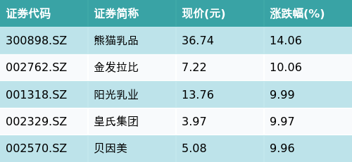 截至早盘收盘,乳业主题涨跌幅最高的五只股票为:熊猫乳品(300898.SZ)、金发拉比(002762.SZ)、阳光乳业(001318.SZ)、皇氏集团(002329.SZ)与贝因美(002570.SZ)。详情见下表:
