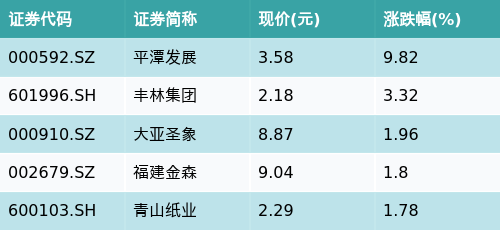 截至早盘收盘,林业主题涨跌幅最高的五只股票为:平潭发展(000592.SZ)、丰林集团(601996.SH)、大亚圣象(000910.SZ)、福建金森(002679.SZ)与青山纸业(600103.SH)。详情见下表: