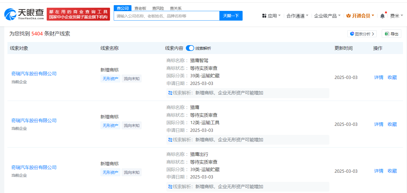 天眼查数据显示,近日,奇瑞汽车股份有限公司(以下简称“奇瑞”)申请注册“猎鹰智驾”“猎鹰”“猎鹰出行”商标,国际分类为运输贮藏、运输工具,当前商标状态均为等待实质审查。