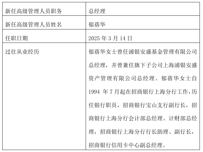 履历显示,郁蓓华曾任浦银安盛基金总经理,并曾兼任旗下子公司上海浦银安盛资产管理有限公司总经理。公开信息显示,郁蓓华在2024年7月1日离任浦银安盛基金总经理。