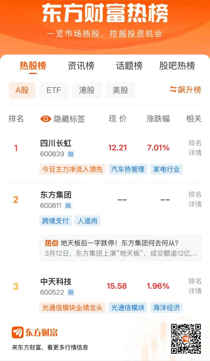 3月17日,两市全天震荡,三大指数涨跌不一。东方财富热股人气榜前三的股票中,四川长虹位列第1,东方集团位列第2,中天科技位列第3。