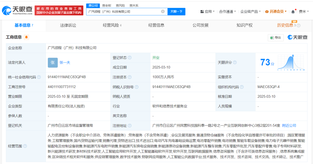 天眼查App显示,近日,广汽领程(广州)科技有限公司成立,法定代表人为张一夫,注册资本1000万人民币,经营范围含新能源汽车整车销售、汽车零配件批发、电子专用材料研发、人工智能应用软件开发、人工智能基础软件开发、人工智能公共数据平台等,由广汽日野汽车有限公司全资持股。