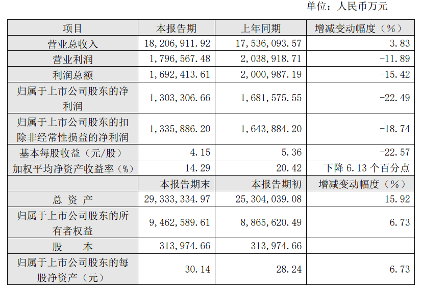 报告期内,公司实现营业收入1820.69亿元,较上年同期增长3.83%;归属于上市公司股东的净利润130.33亿元,较上年同期下降22.49%。报告期末,公司总资产2933.33亿元,较报告期初增长15.92%。