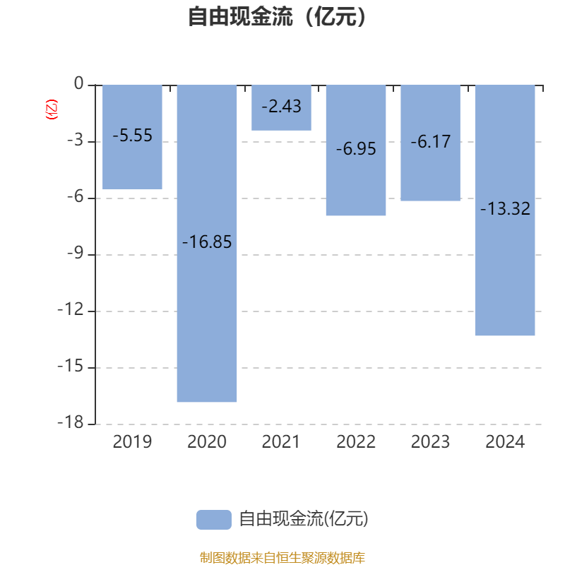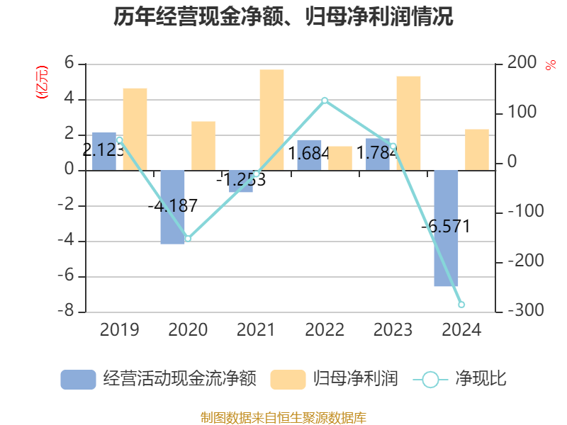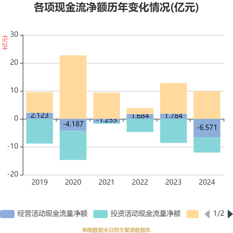 截至2024年,公司经营活动现金流净额为-6.57亿元,同比减少8.35亿元;筹资活动现金流净额9.87亿元,同比减少1.13亿元;投资活动现金流净额-5.49亿元,上年同期为-8.61亿元。
