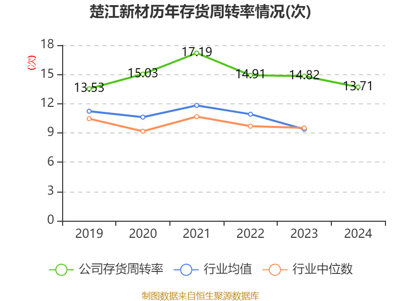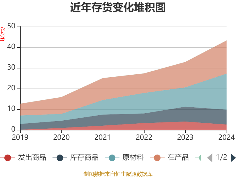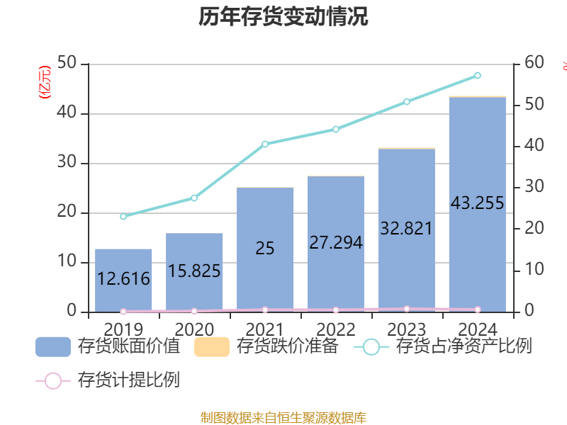 从存货变动来看,截至2024年末,公司存货账面价值为43.25亿元,占净资产的57.16%,较上年末增加10.43亿元。其中,存货跌价准备为2268.12万元,计提比例为0.52%。